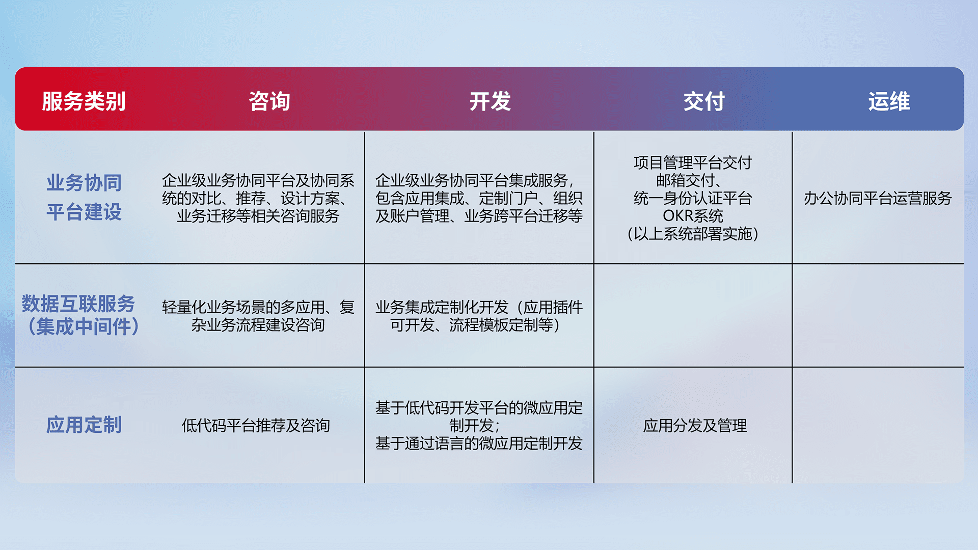 针对钉钉、、、、企微、、IDaas等平台级产品提供产品的规划、、、、方案、、交付、、定制化开发等服务,,,实现如统一协同办公、、智能客户服务、、、混合会议管理、、智能数据查询、、、、等业务场景,,,,实现数字化转型。。。。