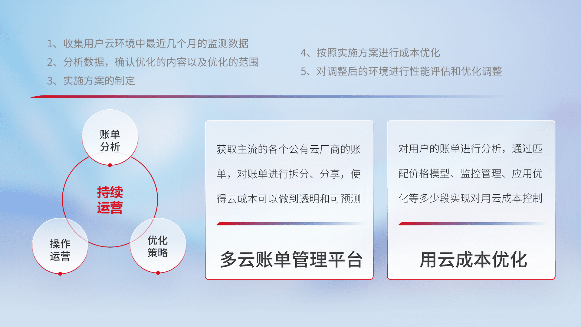 通过多云纳管,,,,以统一的资源数据模型把客户的云资源进行抽象和封装,,,,进而实现对多云资源的统一操作,,,保障云资源管理的可靠性、、、、稳定性与可用性。。量身定制化运维内容,,配置、、、开发运维、、、补丁管理、、、备份、、、监控、、、认证和访问管理、、、审计和日常巡检等,,,,保障在用云过程中的可靠度,,稳定度以及高可用率。。
