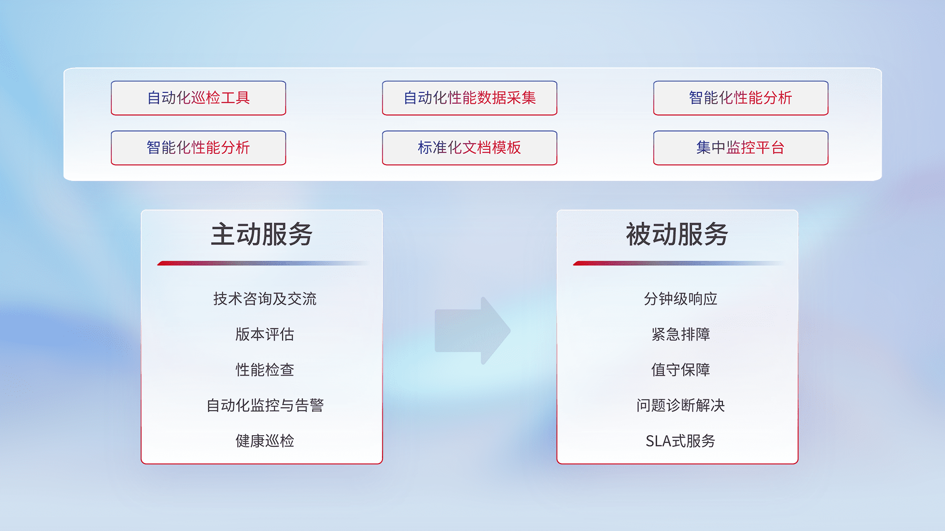 智能化工具和标准化文档,,,保障服务质量,,提供主动服务(包含技术咨询、、版本评估、、、、性能检查、、、、自动化监控与告警、、健康巡检)和被动服务包含(分钟级响应、、紧急排障、、、、值守保障、、、问题诊断解决、、、、SLA服务)。。